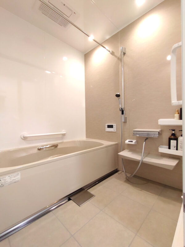 浴槽に脚を伸ばして入れて、滑ってしまうこともなく、ゆったり入れています。3枚引き戸のレールも拭きやすく、お風呂のマグネット収納が取り外しもできるので、掃除もしやすいです。
