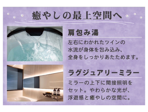 雰囲気も良く、肩包み湯も使ってゆったり入っています。今までよりお風呂が広く感じ、1人で入るのが勿体ないくらいです。